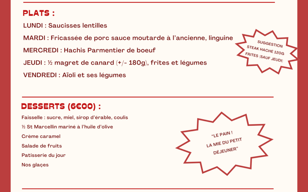 Menu du 09 mars au 15 mars 2026 9 Mar 2026 Menu du 09 mars au 15 mars 2026. Restaurant ouvert Samedi et Dimanche midi.