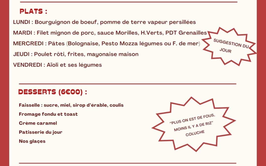 Afterwork Ambiance discothèque Ambiance musicale Apéro-Lecture Bistrot Blind Test Chansons Char Comédie Concert Conférence Corso de la Lavande Culture Diner-Concert Débats Festivités Humour hypnose Jam Session Karaoké Lecture Littérature Livres Majorettes Menu Menu de fêtes Menu de la semaine Menu de Noël Menu à emporter Mets & Vins Musique Noel Plats à emporter Pop Rock Repas de fêtes Repas thématiques Saint-Patrick Saint-Sylvestre Saint Valentin Soirée filles Spectacle Stand up Theâtre Traiteur Valréas